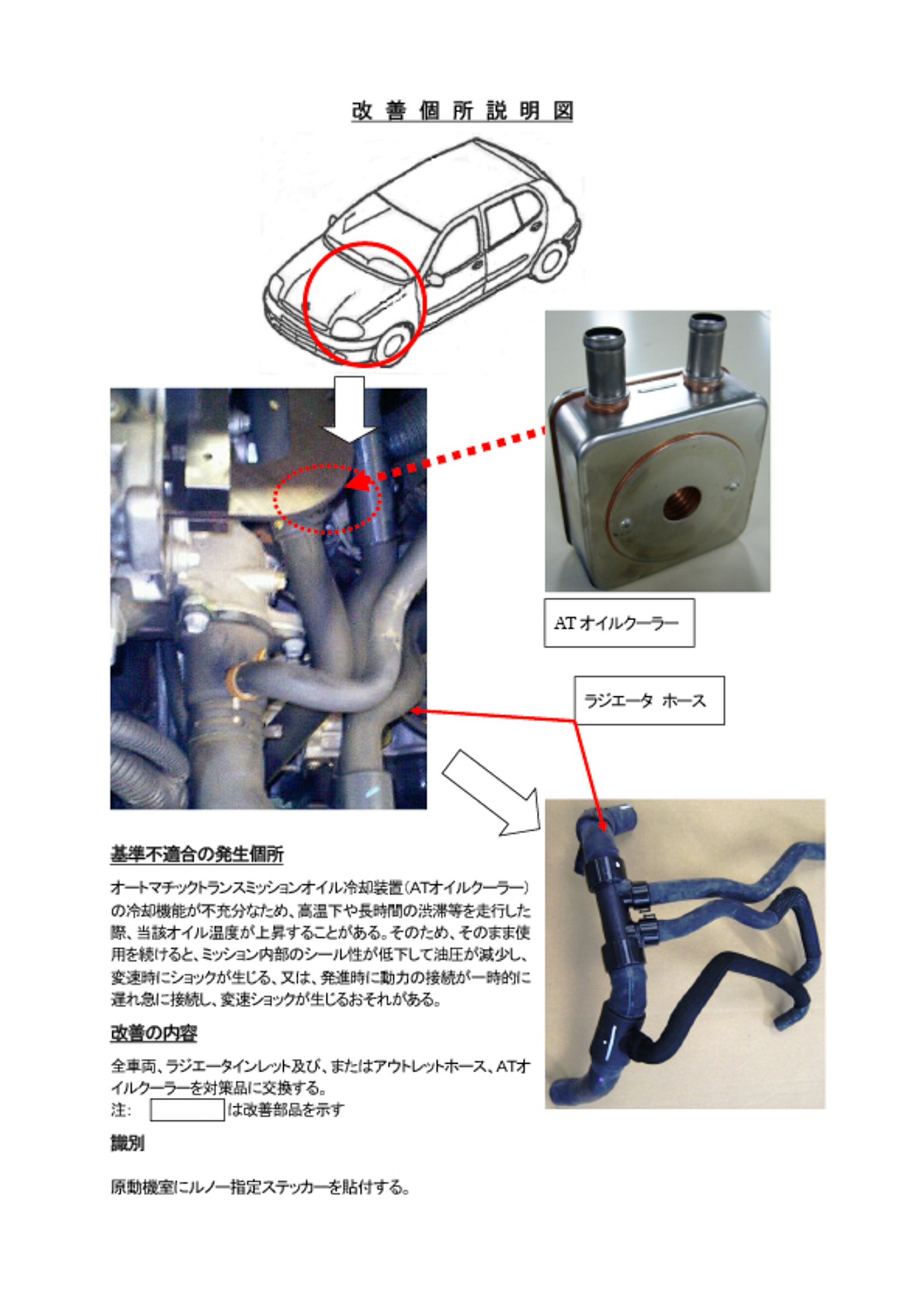 改善措置の内容 | 全車両、ラジエータインレット及び、またはアウトレットホース、ATオイルクーラーを対策品に交換する。 | |||||