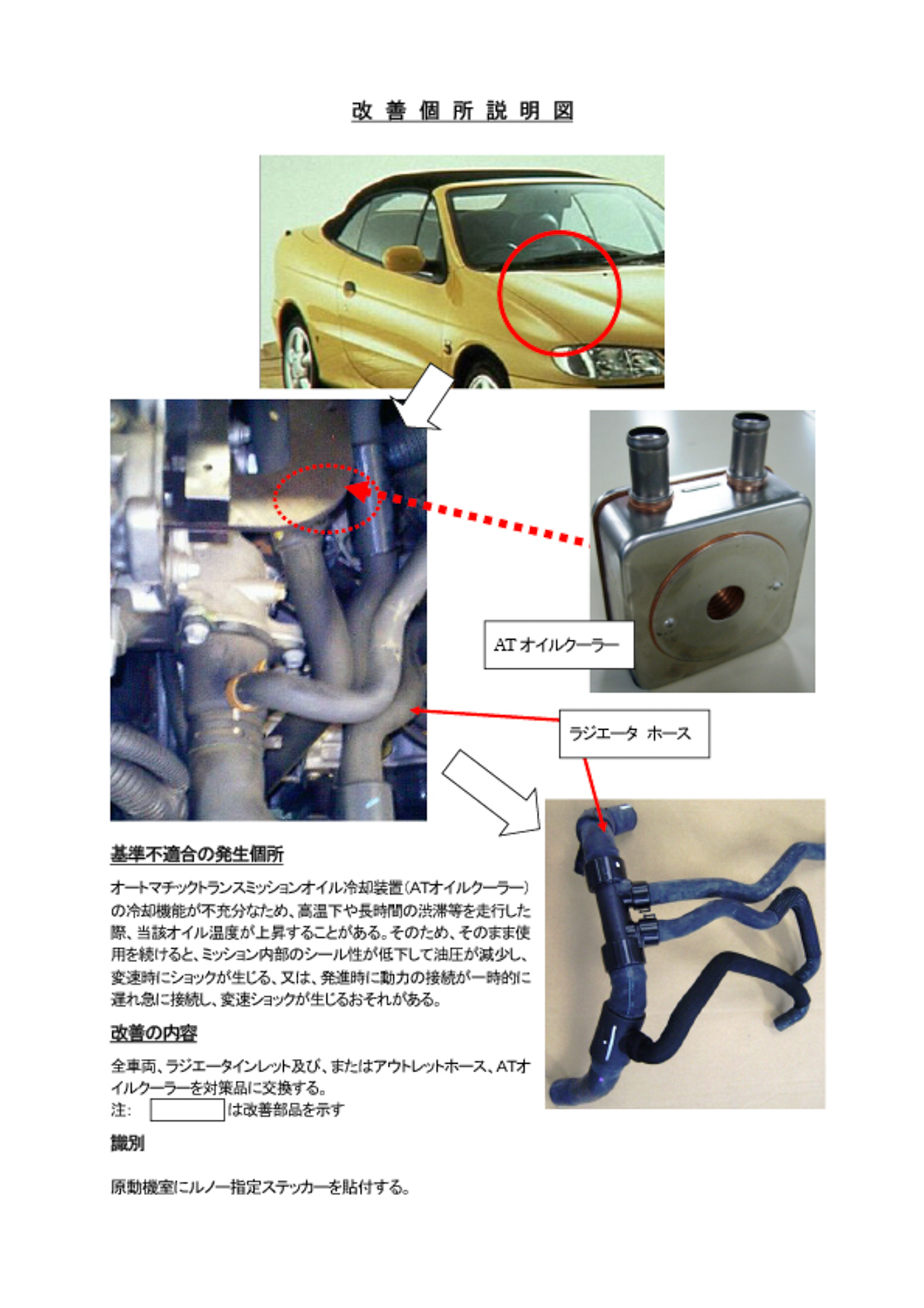 基準不適合状態にあると認める構造、装置又は正能の状況及びその原因 | オートマチックトランスミッションオイル冷却装置(ATオイルクーラー)の冷却機能が不充分なため、高温下や長時間の渋滞等を走行した際、当該オイル温度が上昇することがある。そのため、そのまま使用を続けると、ミッション内部のシール性が低下して油圧が減少し、変速時にショックが生じる、又は、発進時に動力の接続が一時的に遅れ急に接続し、変速ショックが生じるおそれがある。 | |||||