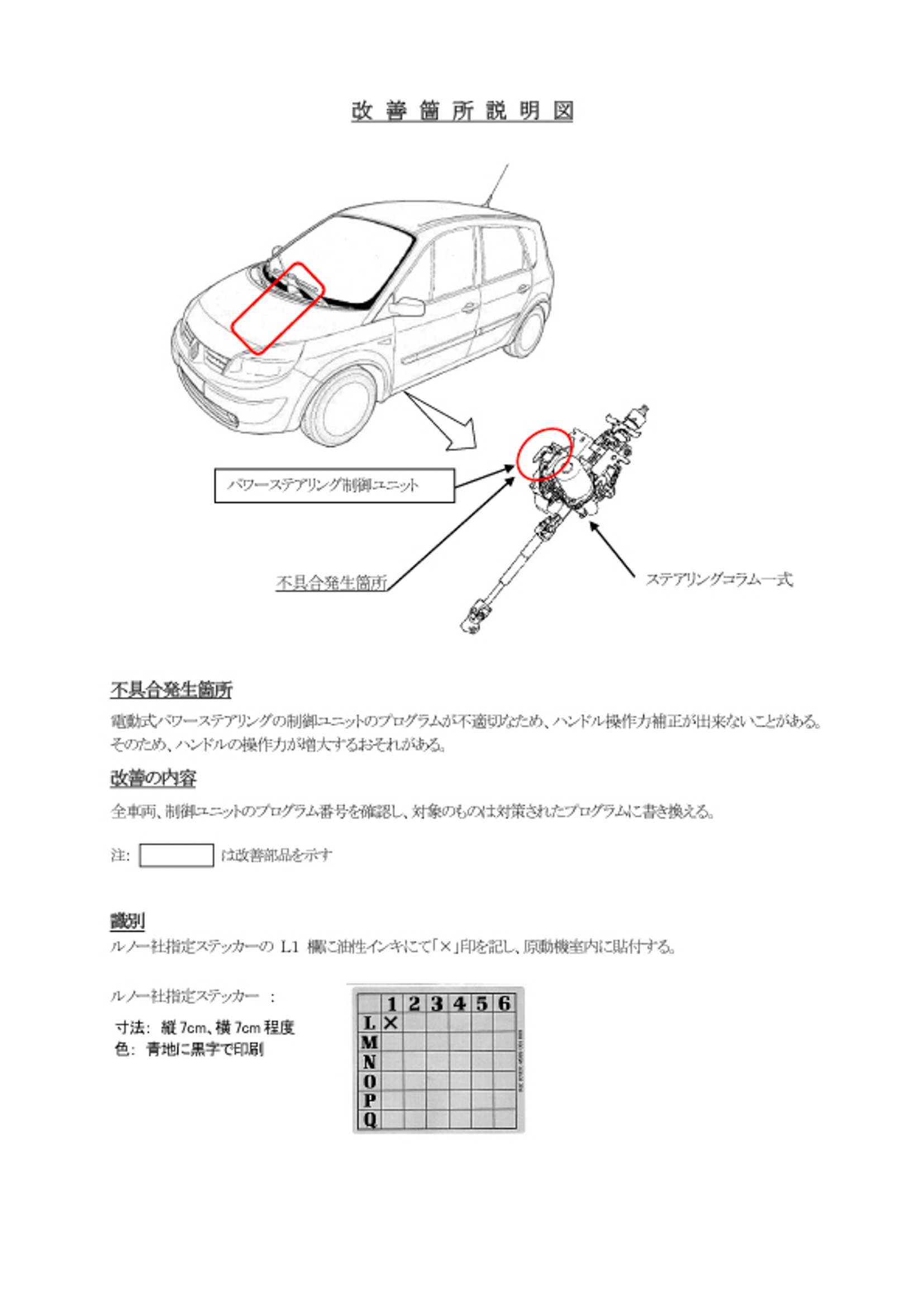 不具合状態にあると認める構造、装置又は性能の状況及びその原因 | 電動式パワーステアリングの制御ユニットのプログラムが不適切なため、ハンドル操作力補正が出来ないことがある。そのため、ハンドルの操作力が増大するおそれがある。 | |||||