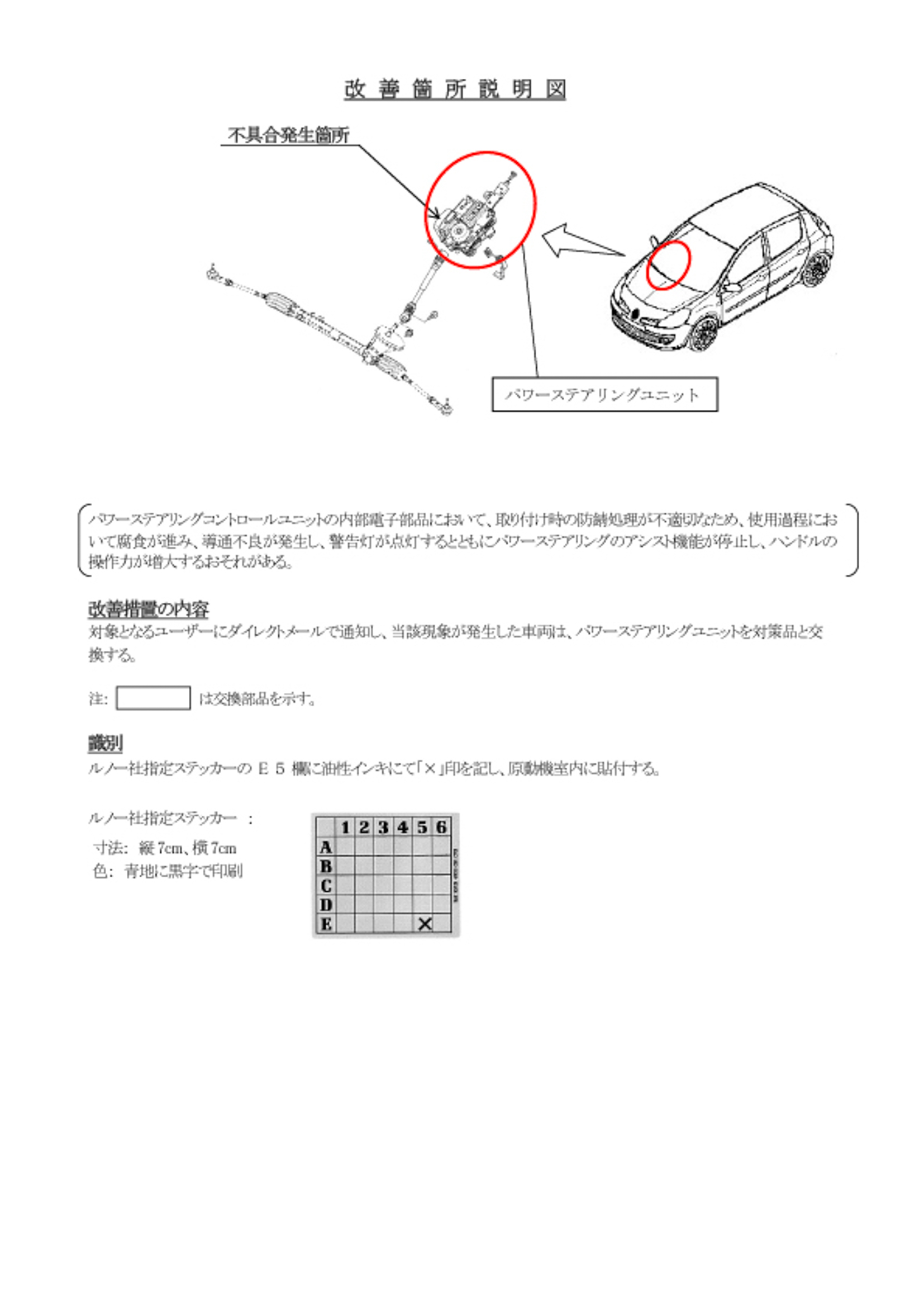 改善の内容 | 対象となるユーザーにダイレクトメールで通知し、当該現象が発生した車両は、パワーステアリングユニットを対策品と交換する。 | |||||