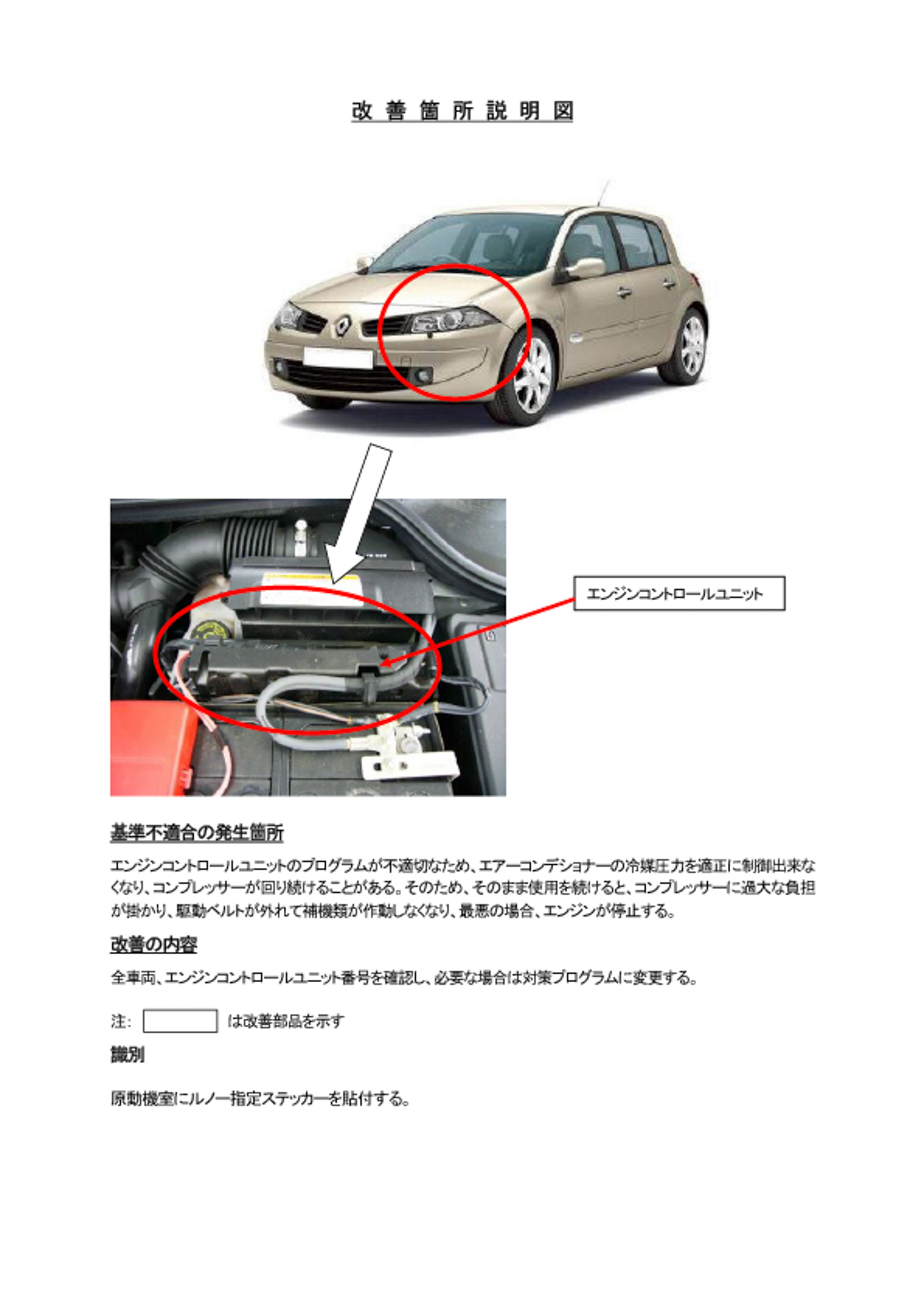 基準不適合状態にあると認める構造、装置又は性能の状況及びその原因 | エンジンコントロールユニットのプログラムが不適切なため、エアーコンデショナーの冷媒圧力を制御しなくなる、そのため、そのまま使用を続けると、コンプレッサーにストレスが掛かり、エンジン回転との差が生じることにより駆動ベルトが外れ、補機類が作動しなくなり、最悪の場合、エンジンが停止する。 | |||||