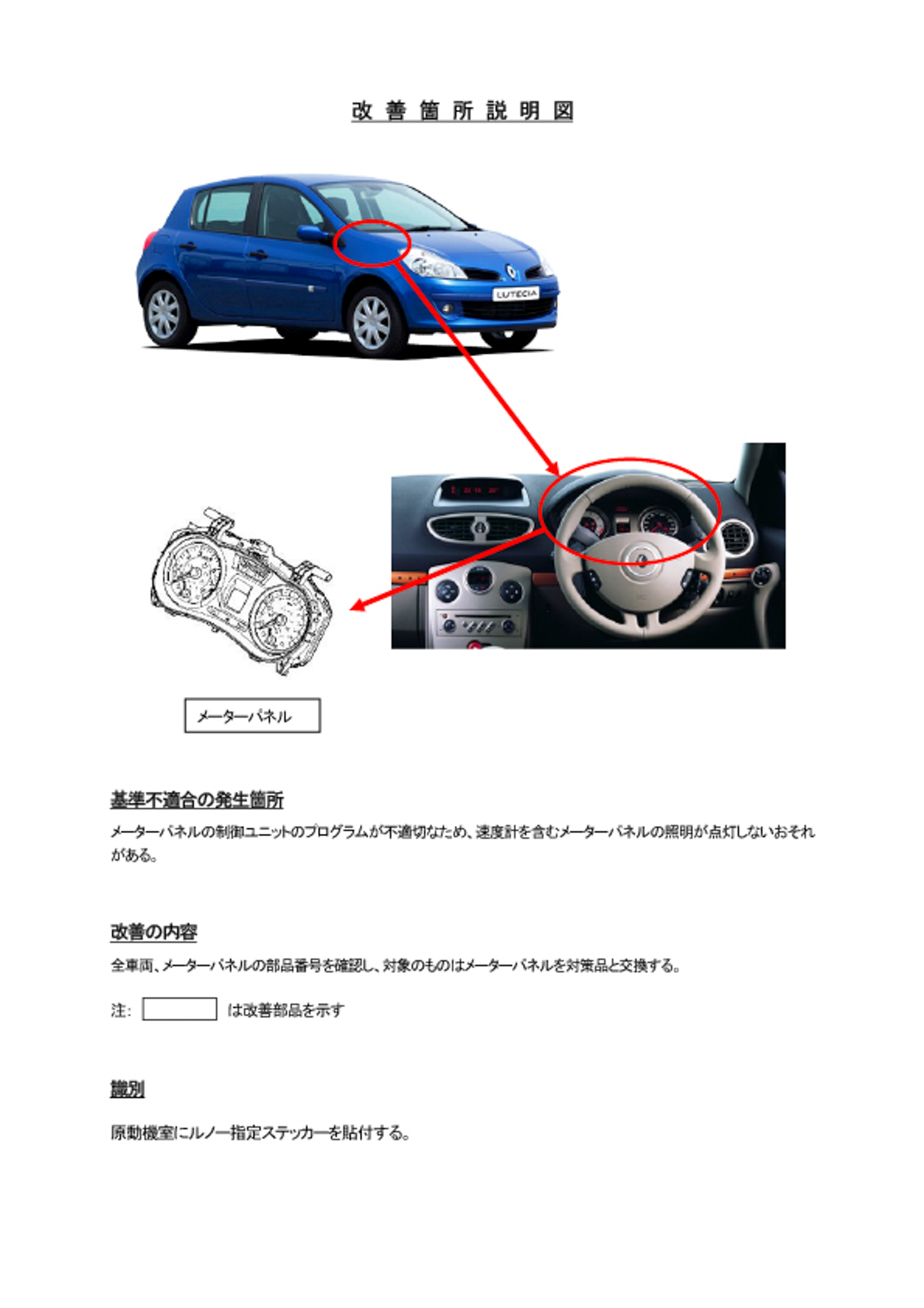 改善措置の内容 | 全車両、メーターパネルの部品番号を確認し、対象のものはメーターパネルを対策品と交換する。 | |||||