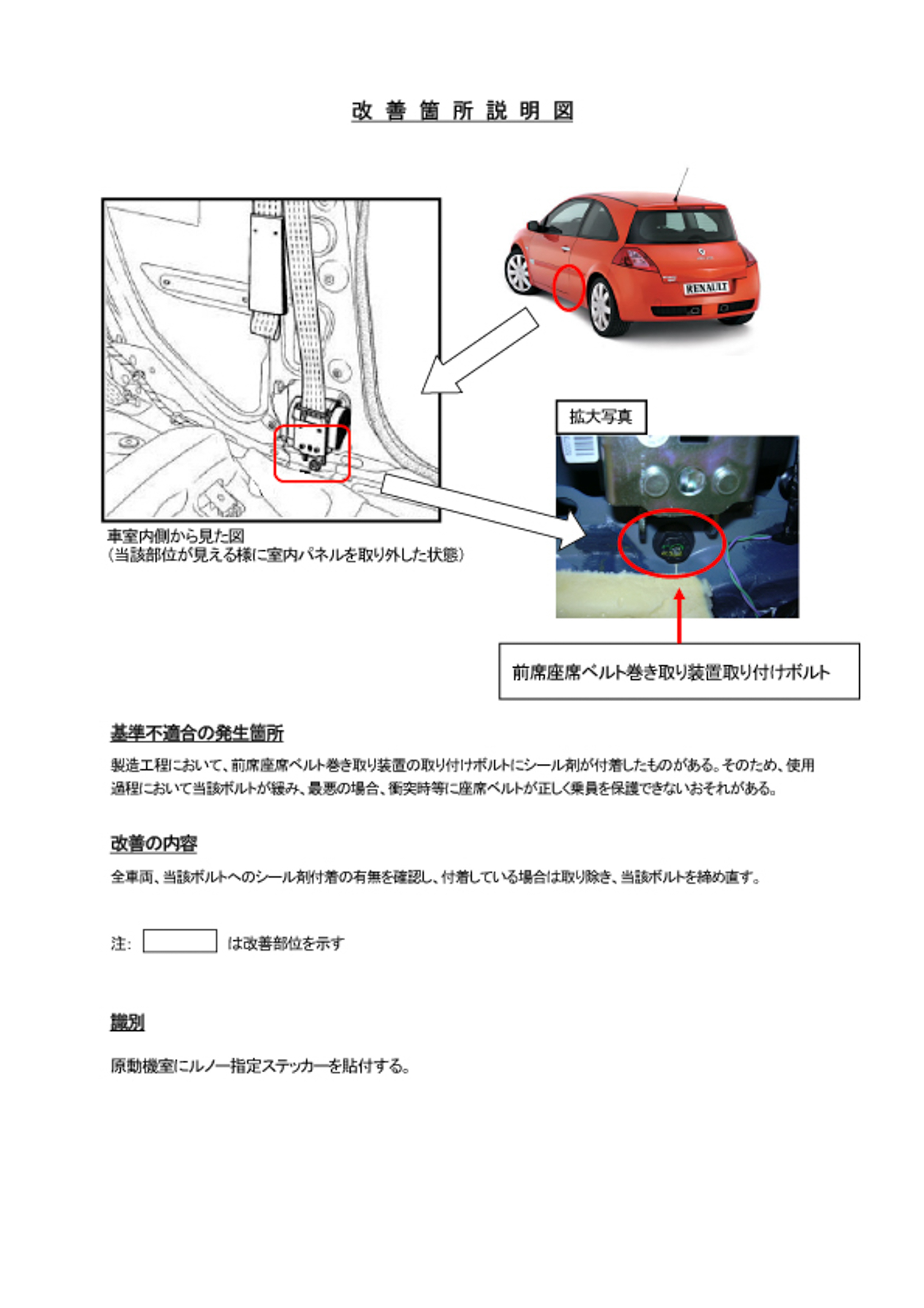 改善措置の内容 | 全車両、当該ボルトへのシール剤付着の有無を確認し、付着している場合は取り除き、当該ボルトを締め直す。 |