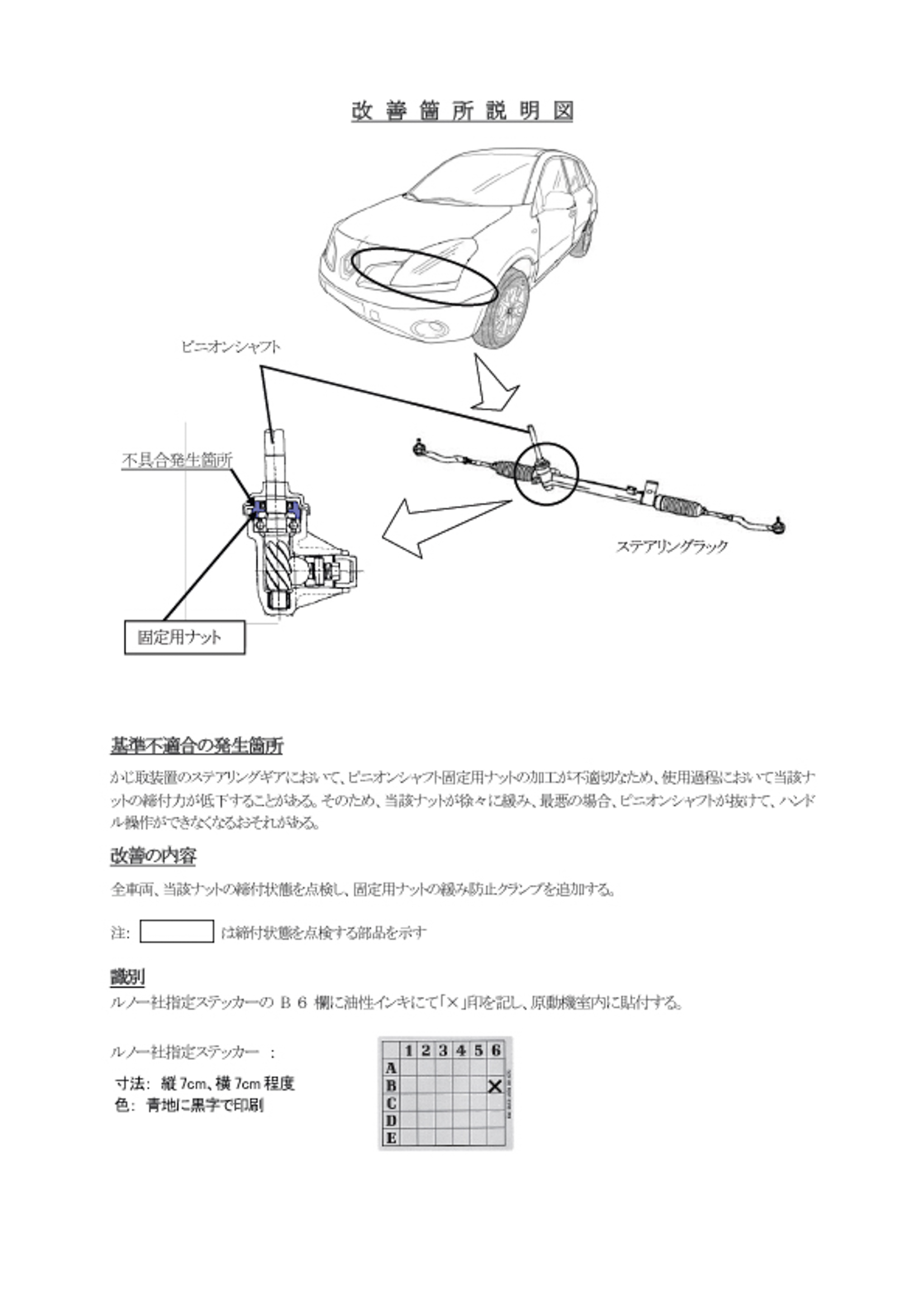 基準不適合状態にあると認める構造、装置又は性能の状況及びその原因 | かじ取装置のステアリングギアにおいて、ピニオンシャフト固定用ナットの加工が不適切なため、使用過程において当該ナットの締付力が低下することがある。そのため、当該ナットが徐々に緩み、最悪の場合、ピニオンシャフトが抜けて、ハンドル操作ができなくなるおそれがある。 |