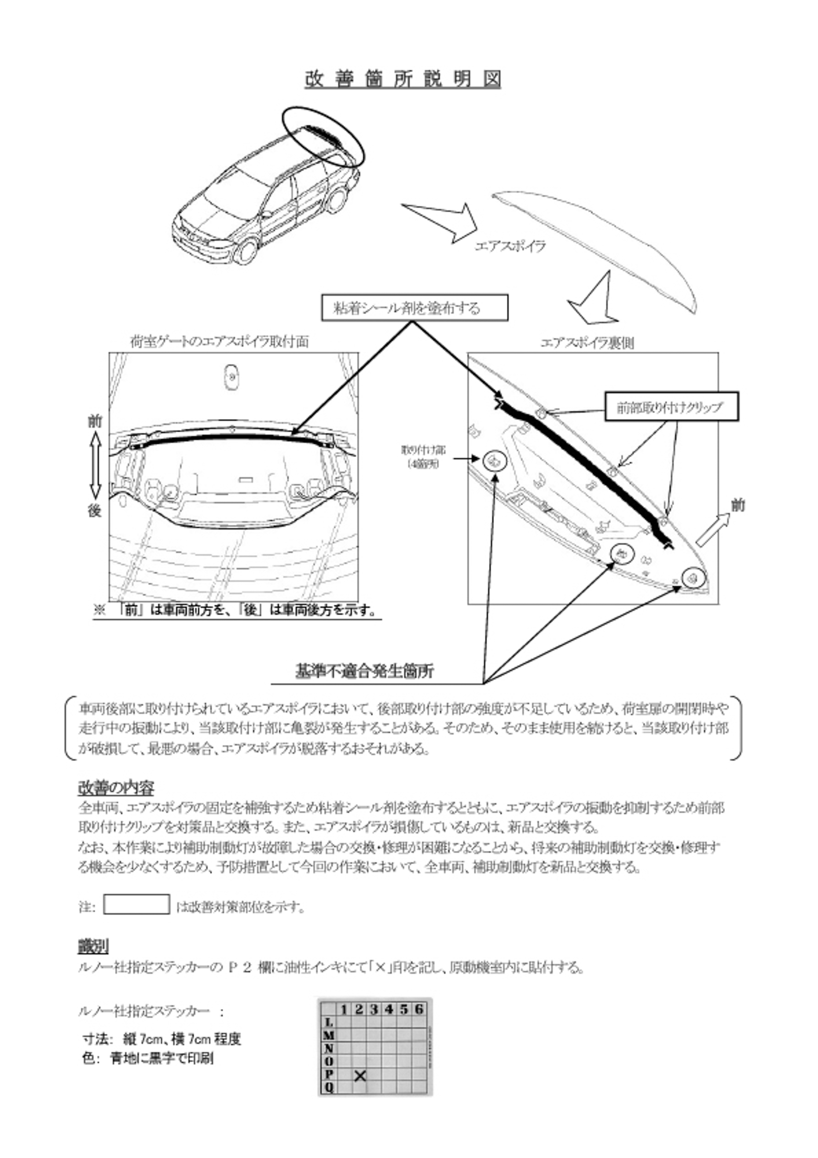 改善措置の内容 | 全車両、エアスポイラの固定を補強するため粘着シール剤を塗布するとともに、エアスポイラの振動を抑制するため前部取り付けクリップを対策品と交換する。また、エアスポイラが損傷しているものは、新品と交換する。 なお、本作業により補助制動灯が故障した場合の交換・修理が困難になることから、将来の補助制動灯を交換・修理する機会を少なくするため、予防措置として今回の作業において、全車両、補助制動灯を新品と交換する。 |