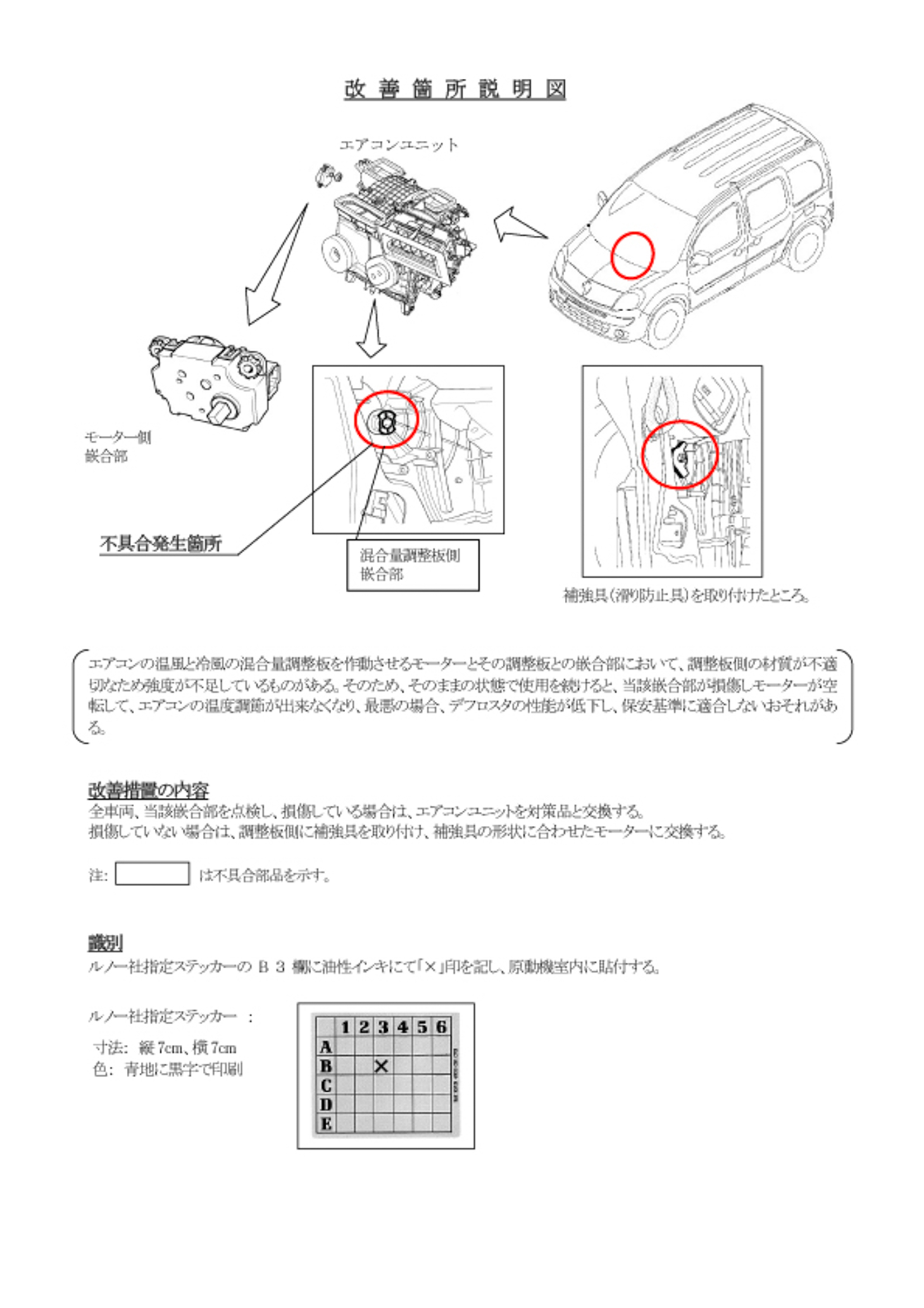 改善措置の内容 | 全車両、当該嵌合部を点検し、損傷している場合は、エアコンユニットを対策品と交換する。 損傷していない場合は、調整板側に補強具を取り付け、補強具の形状に合わせたモーターに交換する。 |