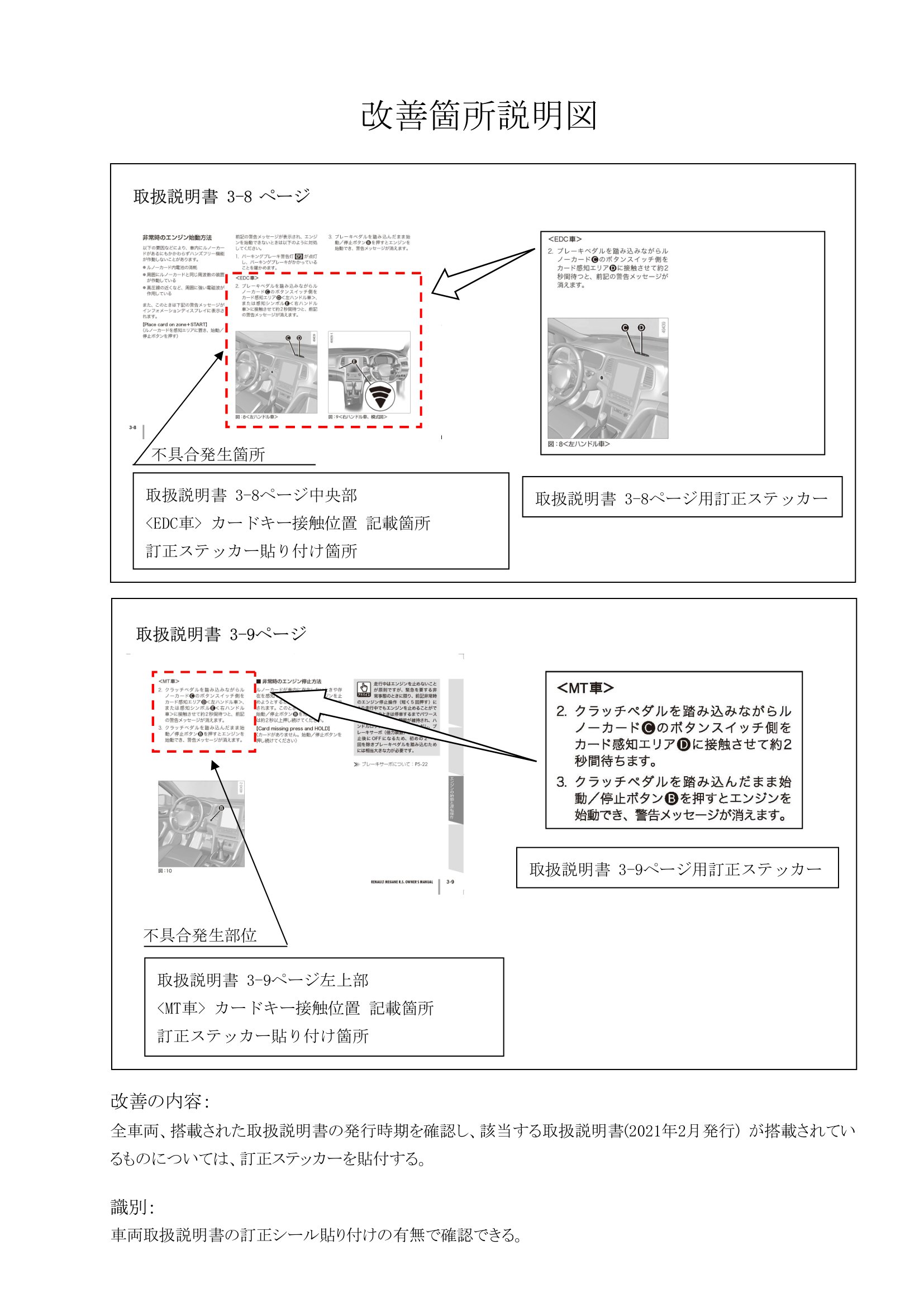 改善の内容 | 全車両、搭載された取扱説明書の発行時期を確認し、該当する取扱説明書(2021年2月発行) が搭載されているものについては、訂正ステッカーを貼付します。 | |||||