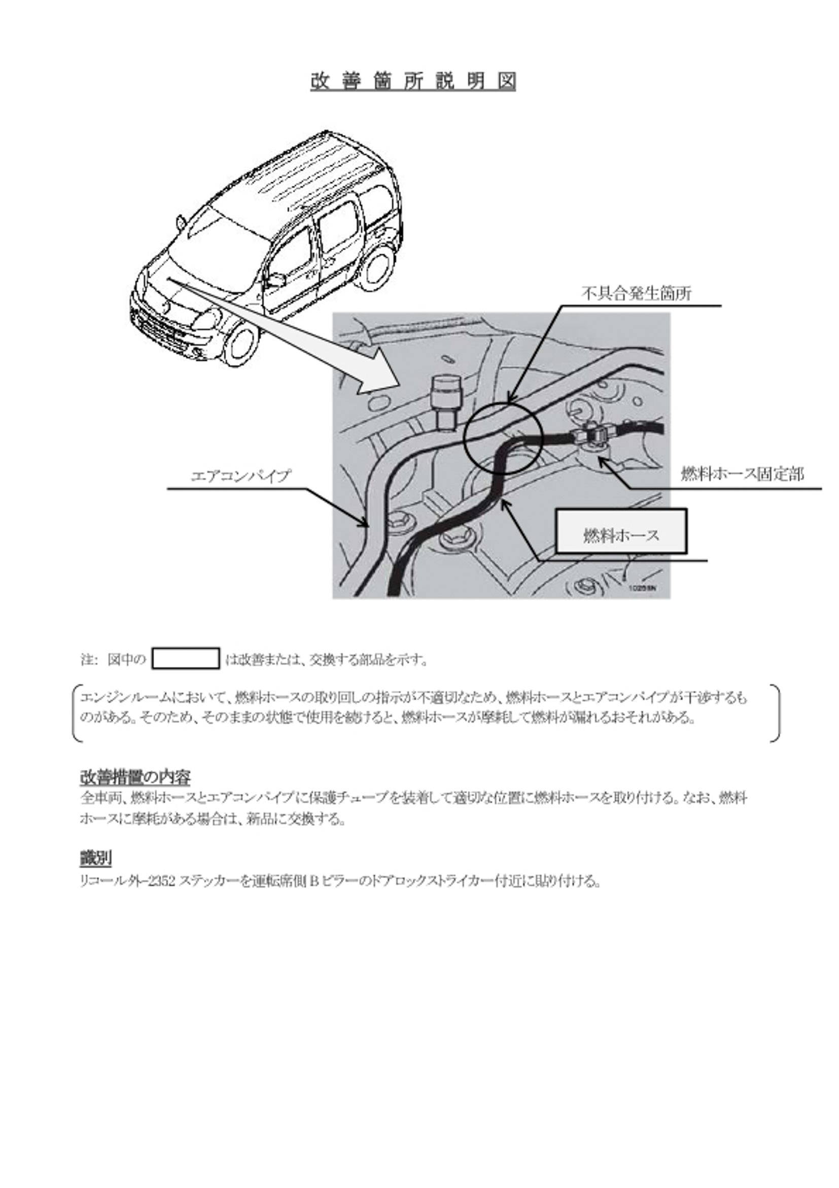 改善措置の内容 | 全車両、燃料ホースとエアコンパイプに保護チューブを装着して適切な位置に燃料ホースを取り付ける。なお、燃料ホースに摩耗がある場合は、新品に交換する。 |