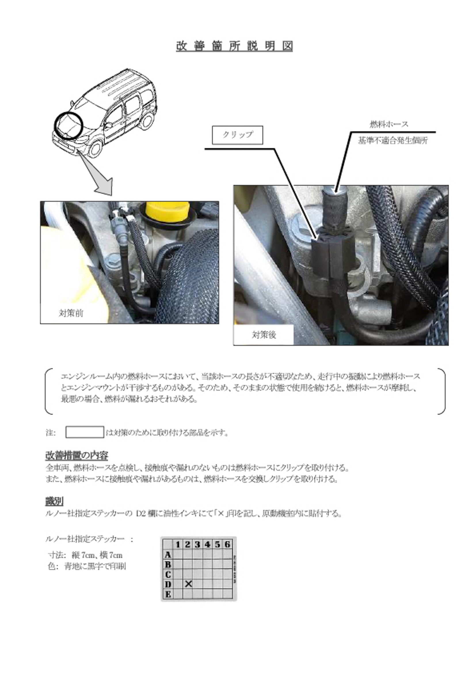 改善措置の内容 | 全車両、燃料ホースを点検し、接触痕や漏れのないものは燃料ホースにクリップを取り付ける。また、燃料ホースに接触痕や漏れがあるものは、燃料ホースを交換しクリップを取り付ける。 |