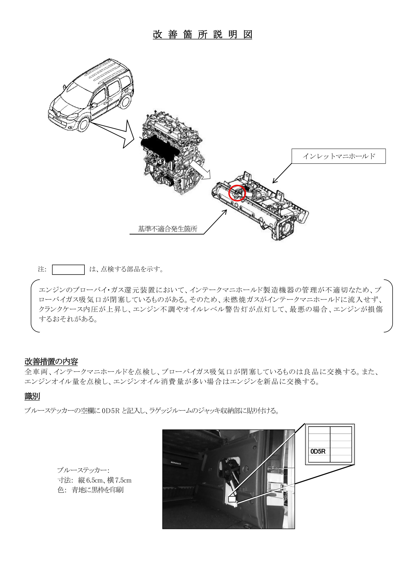 改善措置の内容 | 全車両、インテークマニホールドを点検し、ブローバイガス吸気口が閉塞しているものは良品に交換します。また、エンジンオイル量を点検し、エンジンオイル消費量が多い場合はエンジンを新品に交換します。 |
