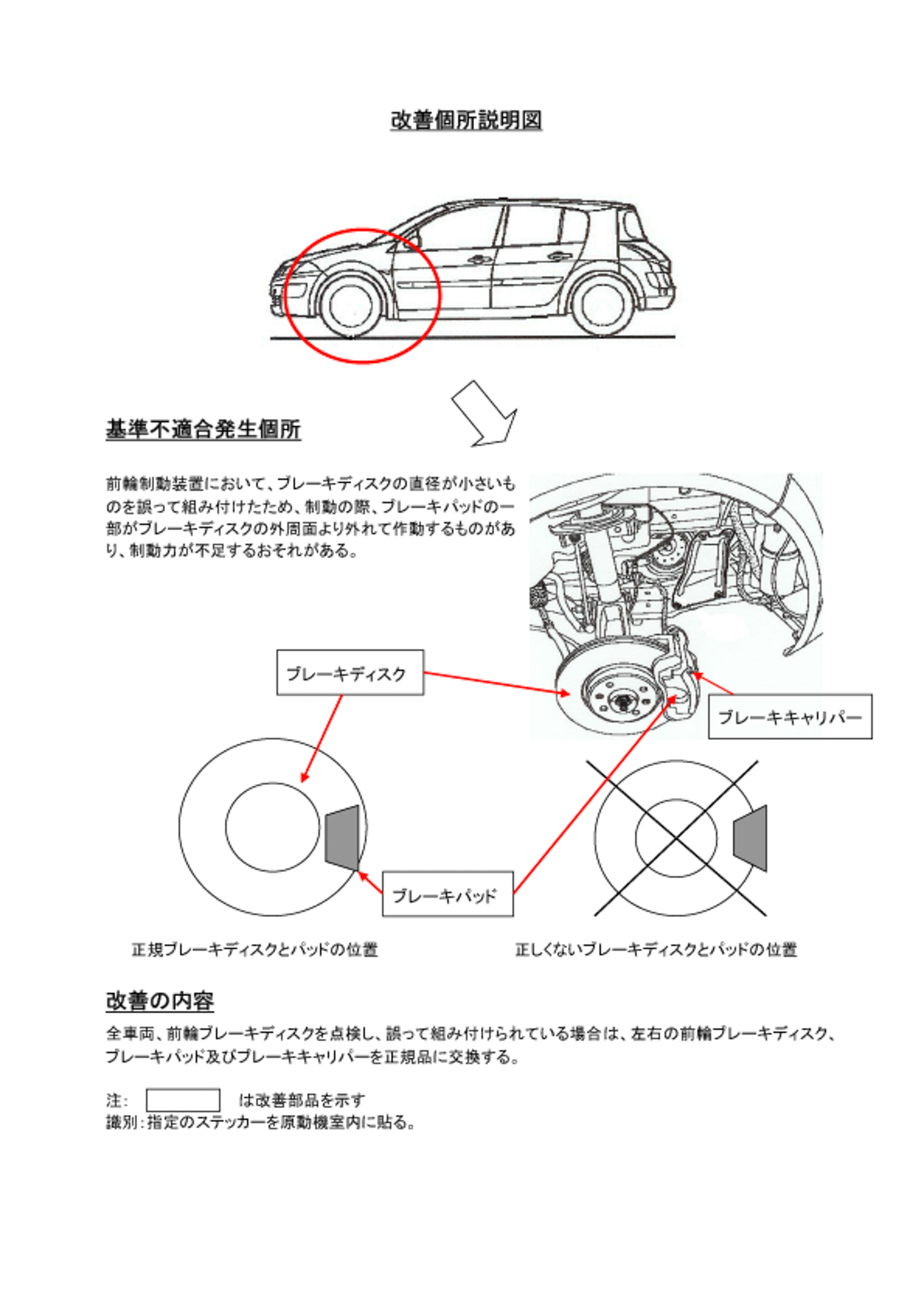 改善措置の内容 | 改善措置の内容 全車両、前輪ブレーキディスクを点検し、誤って組み付けられている場合は、左右の前輪ブレーキディスク、ブレーキパッド及びブレーキキャリパーを正規品に交換する。 | |||||