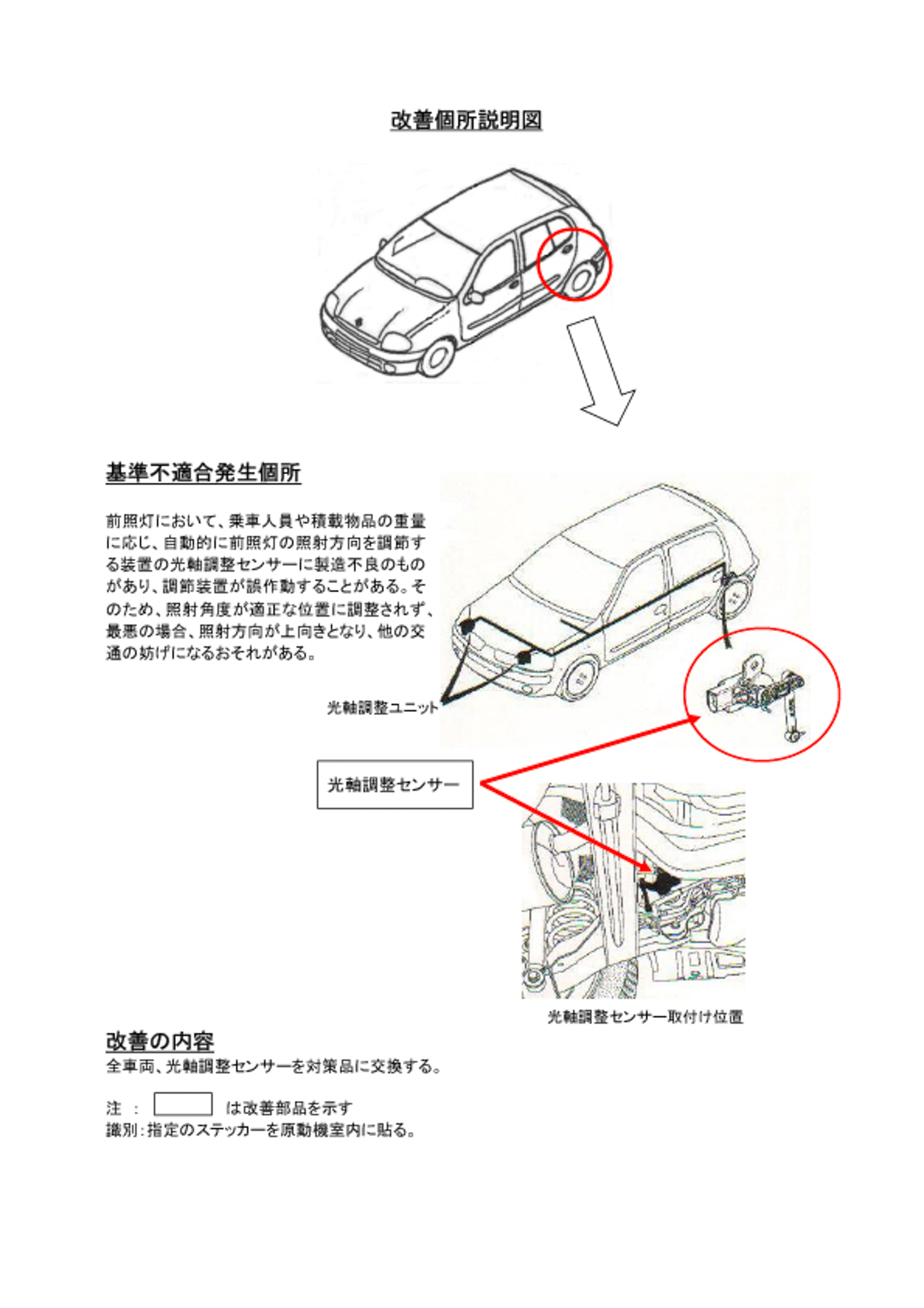 改善措置の内容 | 全車両、光軸調整センサーを対策品に交換する。 | |||||