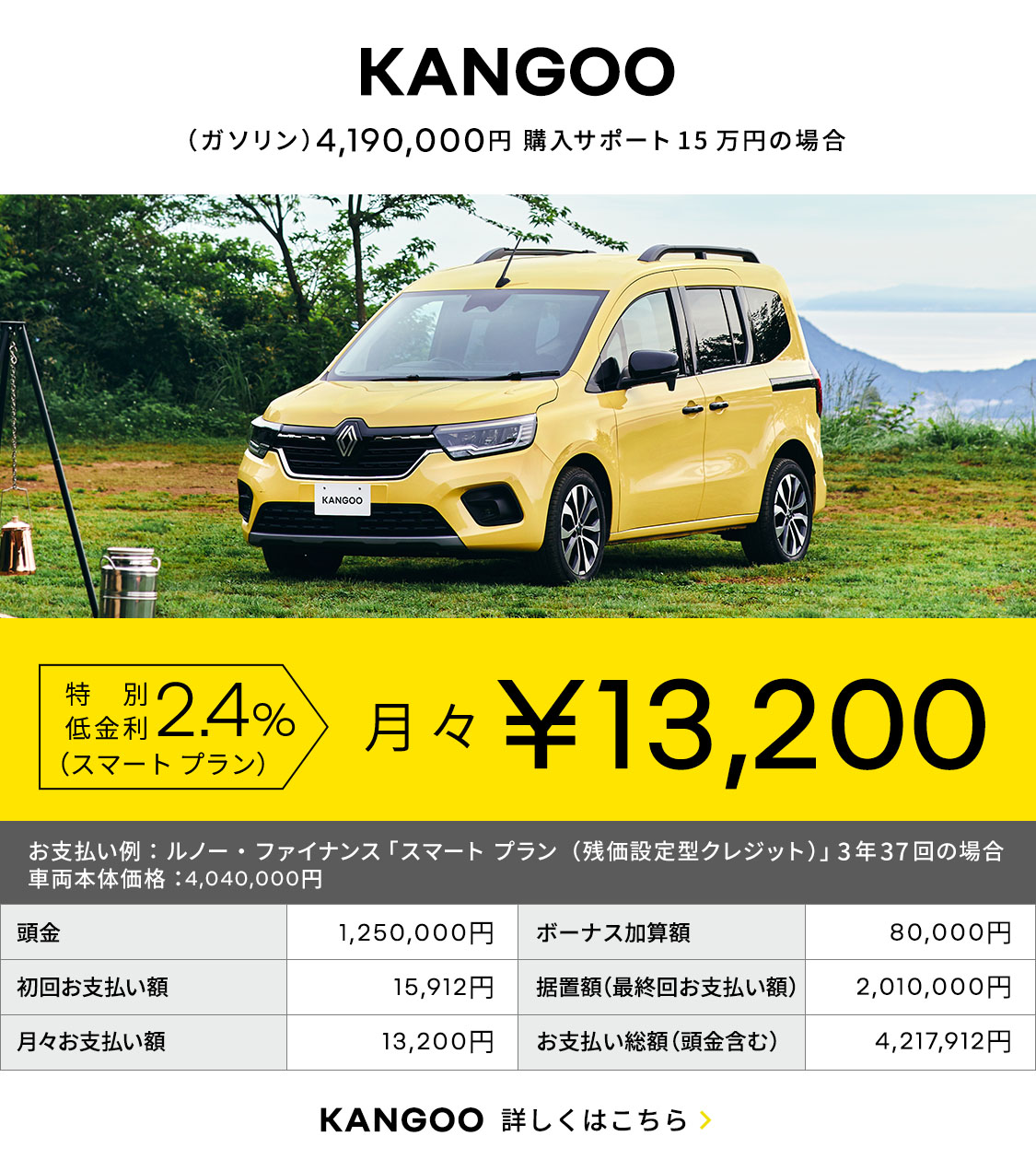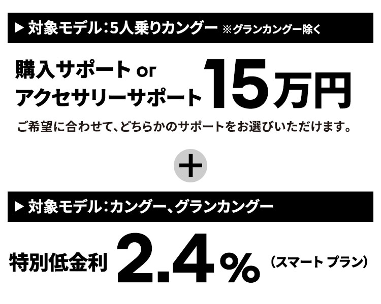 実施期間:2026年2月1日(日)~3月31日(火)内容:期間中、対象モデルを新車でご成約かつご登録いただいたお客様に、15万円のアクセサリーサポートまたは購入サポートを提供いたします。さらに、3月31日(火)まで対象モデルを新車でご成約いただいたお客様に、2.4%特別低金利(スマート プラン)を提供いたします。