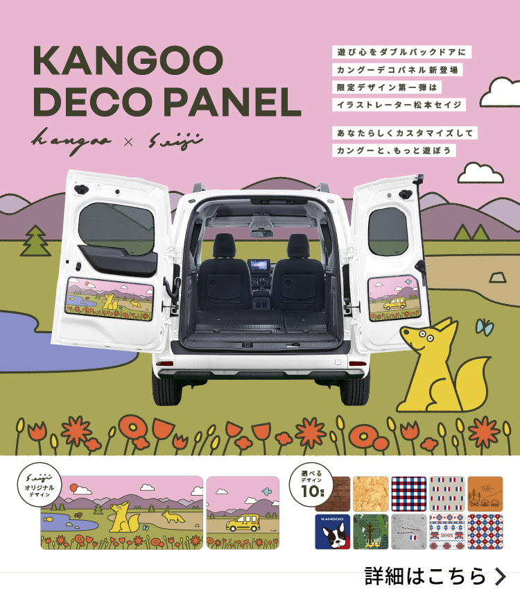 趣味や暮らしの可能性を大きく広げるフランス生まれの遊べる空間「ルノー カングー」。日常をより鮮やかに、遊びをもっと楽しくしてくれるカングーを自分らしくアップデートする専用アクセサリー「カングー デコパネル」が登場しました。木目やトリコロール、ギンガムチェックなど、個性あふれる全10種類のデザインから自由に選んでカングーのダブルバックドアをデコレーションできるこのアイテムを、フェア期間中にご成約いただいたお客様にもれなくプレゼントいたします!