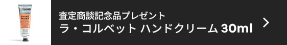 フェア期間中、商談査定*いただいたお客様に、オーガニック由来のオリーブオイルと天然シアバターを配合した 「ラ・コルベット ハンドクリーム 30ml」 をプレゼントいたします。4種類の香りからおひとつお渡しいたします。